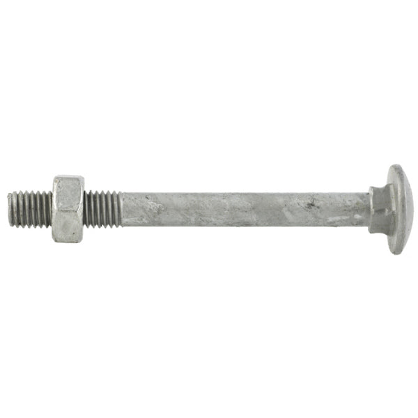 Låseskrue DIN603 med mutter DIN555 varmforsinket. Kvalitet 8.8, delgjenget. Bruksområde: Tre mot tre og beslag i tre. Korrosjonsklasse: C4 - Utendørs: Industri og kyststrøk med moderat saltinnhold. Innendørs: Kjemiske bedrifter, svømmebasseng, skipsverft, båtbyggerier.