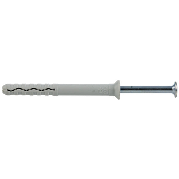 Spikerplugg. Belastning: Lett/Middels. Bruksområde: Treverk mot betong og mursten (må ikke brukes i porebetong (lettbetong) og Leca. Gjennomgående montasje, du trenger kun hammer og bor. Forsenkes i materialet og økonomisk i bruk. Bordimensjon = Pluggdimensjon. NB: Skrutrekkersporet på spikerens hode er KUN der for at pluggen skal kunne demonteres!
