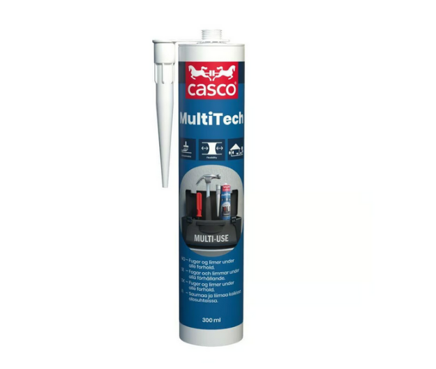 Casco MultiTech er en elastisk lim- og fugemasse for nærmest alle arbeidsoppgaver til boligen, hytta, båten eller andre utfordrende oppgaver både ute og inne. Produktet har et bredt anvendelsesområde, og sikrer god vedheft til mange typer underlag. Tåler bevegelse, støt, vibrasjoner og store temperatursvingninger, og er godt egnet til gulvfuging. Rett og slett en "verktøykasse på patron!" Finnes i fargene: White, Light Grey, Grey, Black, Light Wood, Dark Wood og Exotic Wood