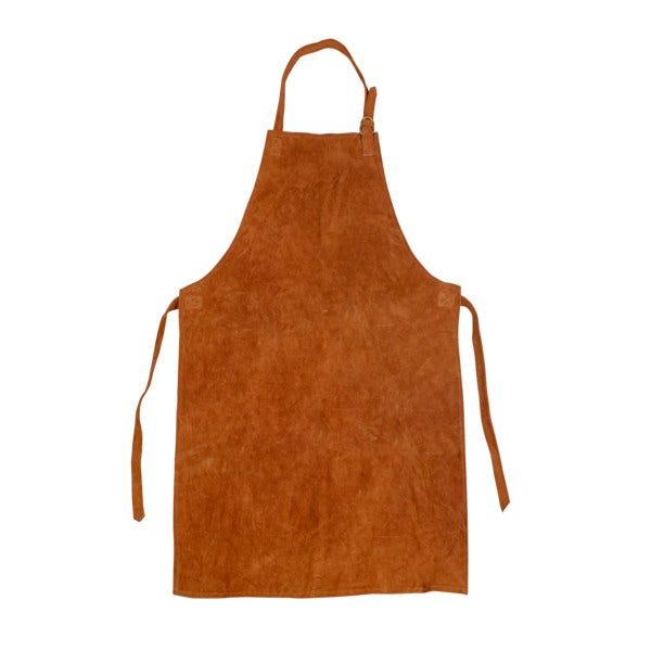 Bålforkle av cognacbrunt, semsket kuskinn med justerbart nakkebånd, knytesnor rundt livet, samt praktisk lomme og to opphengsløkker på brystet. Semsket skinn er et bruksmateriale som over tid får flekker. B: 63 cm / L: 92 cm. Snorlengde: 2 x 80 cm.