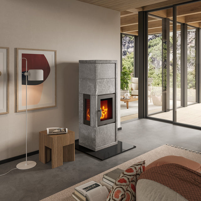 Kube ovnene fra Norsk Kleber har klassiske, rene linjer, med noen fine detaljer, som side-glassene som er plassert i steinen, uten stålramme. Kube ovnen kan fås med eller uten sideglass, samt i ulike høyder. Som alle våre ovner er døren utført i høy-kvalitets støpejern, noe som gjør den robust og gir den lang levetid. Alle våre Kube-modeller fås med grå dør. Side glassene er doble, for å sikre en god forbrenning og begrenset med varme-utstråling gjennom glassene. Kube kan også fås som en hybrid som fyres både med ved og pellets. Dette gir deg stor fleksibilitet i valg av brensel og gjør ovnen tilpasningsdyktig til ulike situasjoner og behov. Ta kontakt om du ønsker tilbud på hybrid varianter eller andre varianter. Kube ovnene leveres med 2 sideglass / med 1 sideglass / uten sideglass