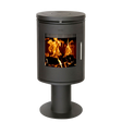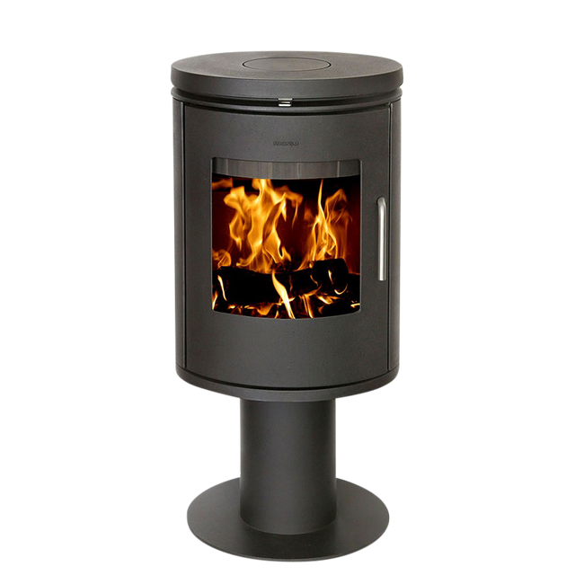 Morsø vedovn 6148 i støbejern på pidestall. En elegant og tidløs serie med imponerende sjel og kapasitet. Hele serien pryder stuen på en diskret og stilfull måte med ovnenes karakteriske ovale utforming.
