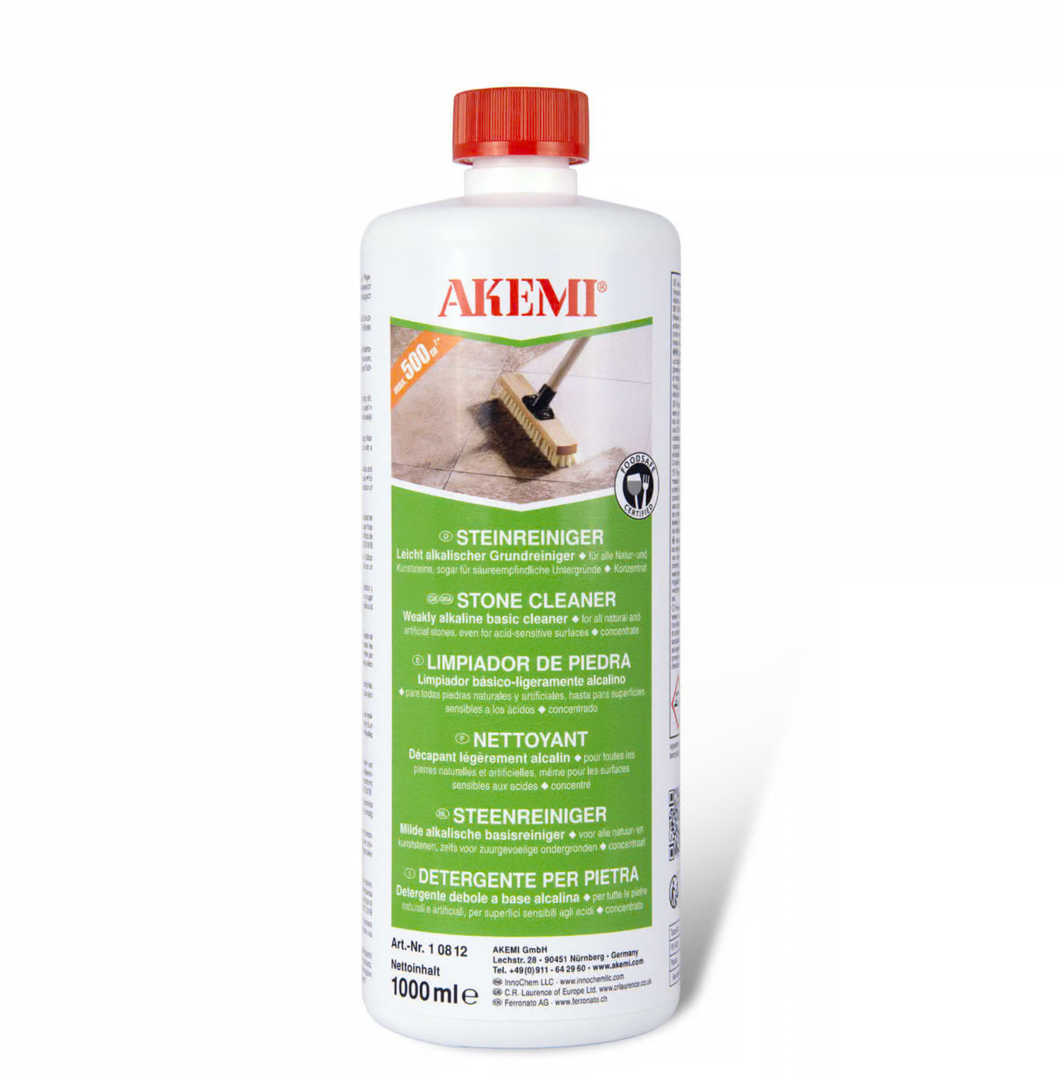 Akemi Steinrens a 1 Liter brukes til grovrengjøring. F AKEMI Steinrens fjerner belegg etter andre pleiemidler, olje- og fettsmuss, svakt sementslør, rust- og tjære-flekker samt rester av kunststoffarger og puss fra alle natur- og kunststein som marmor, travertin, terazzo, granit, tegl- og cotto-plater, fliser og betong. Forbruk: ca. 10-20m2/liter (ufortynnet).