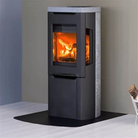 Vedovn i støpejern kledd med varmelagrende kleberstein. Dette er en konveksjonsovn som er enkel å plassere i rommet da den kan monteres nær brennbar vegg. Konveksjon oppnås med en «ekstra» yttervegg som tillater luftsirkulasjon mellom selve brennkammeret og ytterveggene, og lavere temperatur på utsiden av vedovnen. Vedovnen har glass på tre sider som gir godt innsyn til flammene, og én lufteventil som gjør det enkelt å fyre. Et praktisk oppbevaringsrom i sokkelen skjules av en solid dør i støpejern. Vedovnen er også utstyrt med luftspyling som bidrar til å holde glasset rent NB: Vi har kun to stk igjen av denne, første mann/ kvinne til mølla.